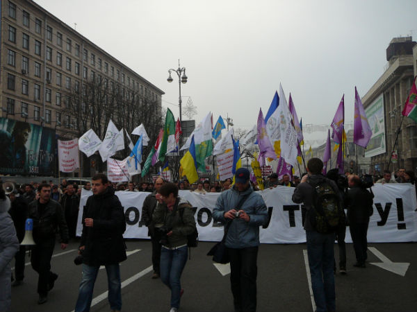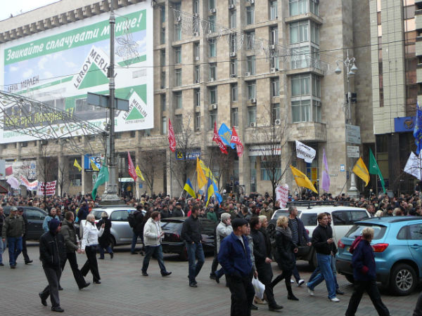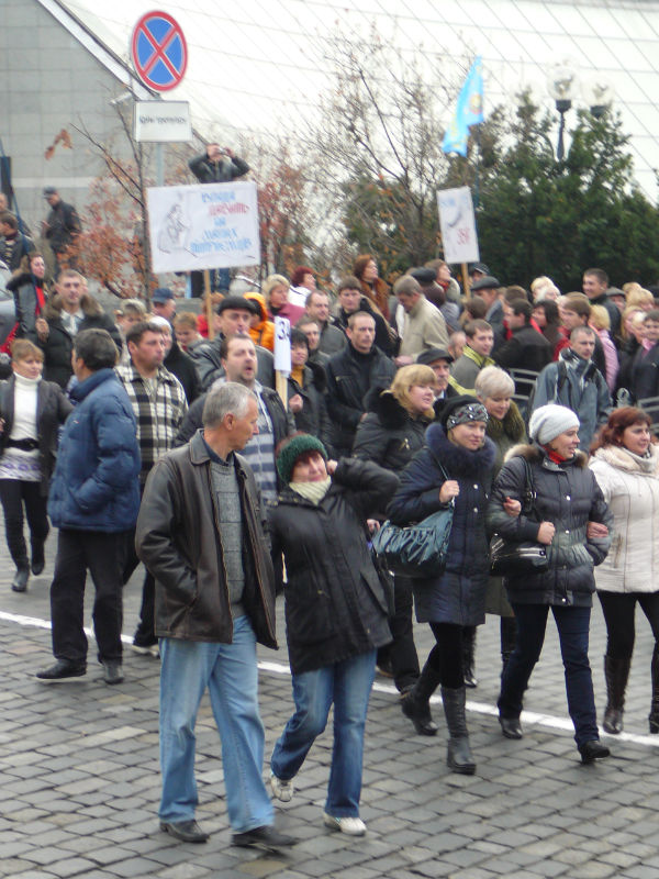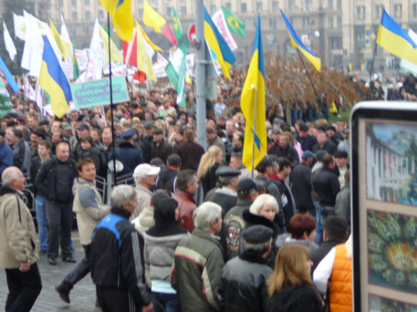 9.50 На Майдані чотири тисячі осіб готові йти під Раду. Прапорів дуже багато – від червоно-чорних до прапорів ринку Троєщина. Гасло троєщинців: «Ні – податковому кодексу Азарова та Тігіпка». Ринок вийшов на вулицю. Видно прапори ринку "Петрівка".