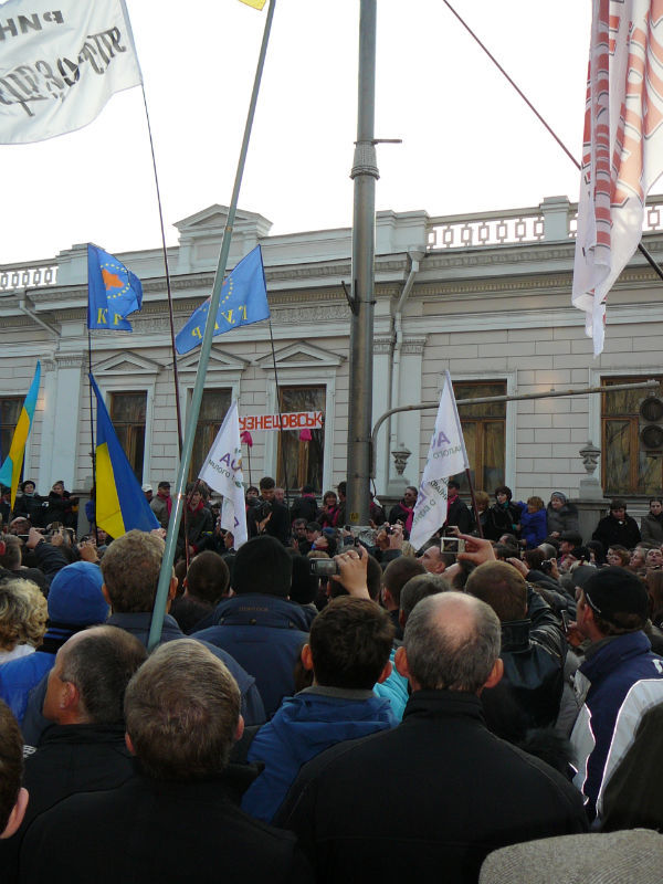 10.46 Надійшло СМС-повідомлення від іншого нашого кореспондента. "Двинулись дальше, к ВР. Слились еще с одной толпой. Митингуют под Радой около 20 тыщ. Замечен авторынок "Куяльник". Лозунг "Ганьба новій владі".